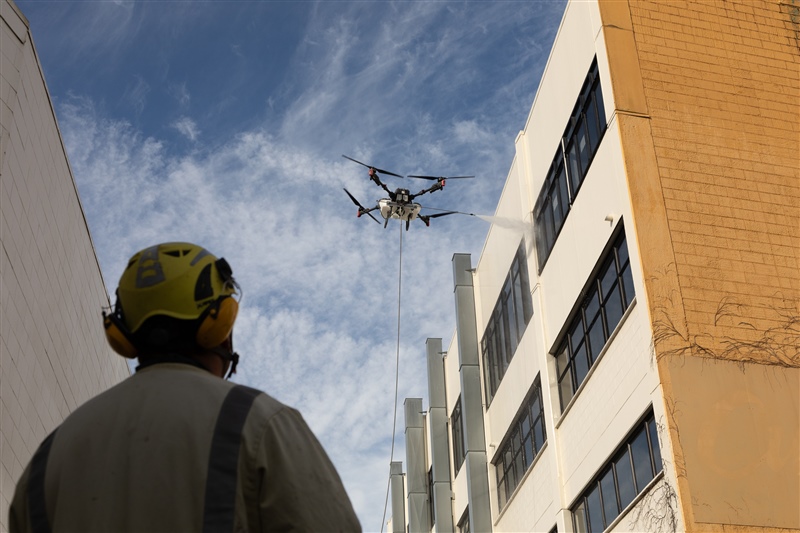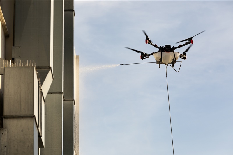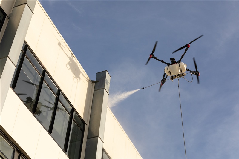The water blaster remains safely on the ground, while the drone lifts the hose and nozzle for direct, high-pressure cleaning from above.